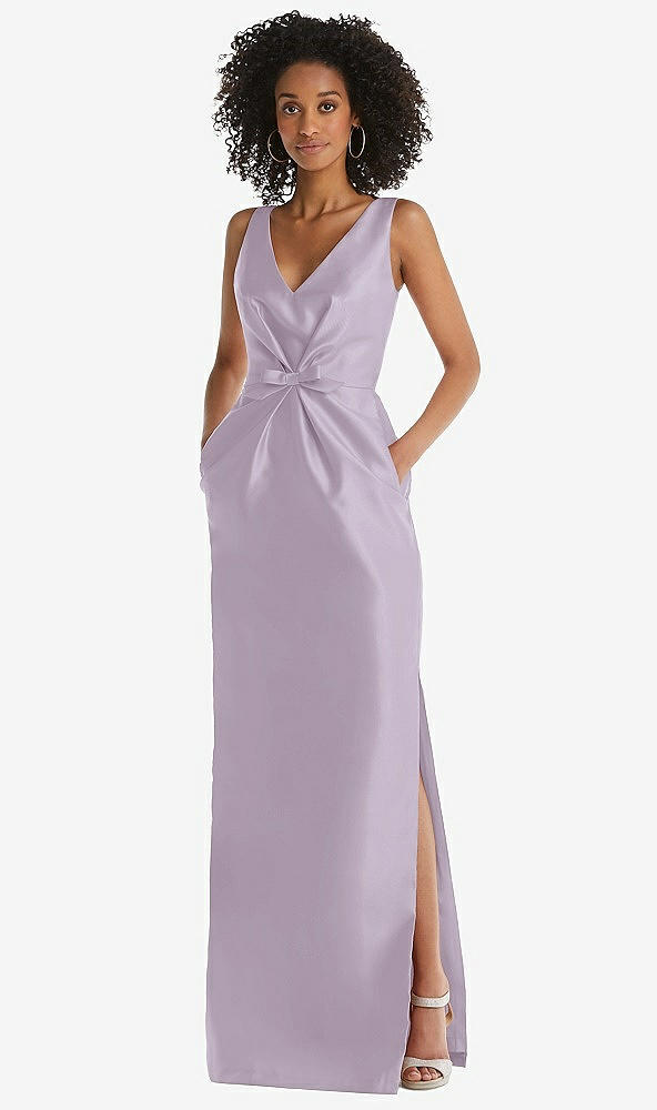 Pleated Bodice Satin Maxi Pencil Dress with Bow Detail in Lilac Haze