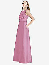 High-Neck Asymmetrical Shirred Satin Maxi Dress with Pockets in Powder Pink & Mojito