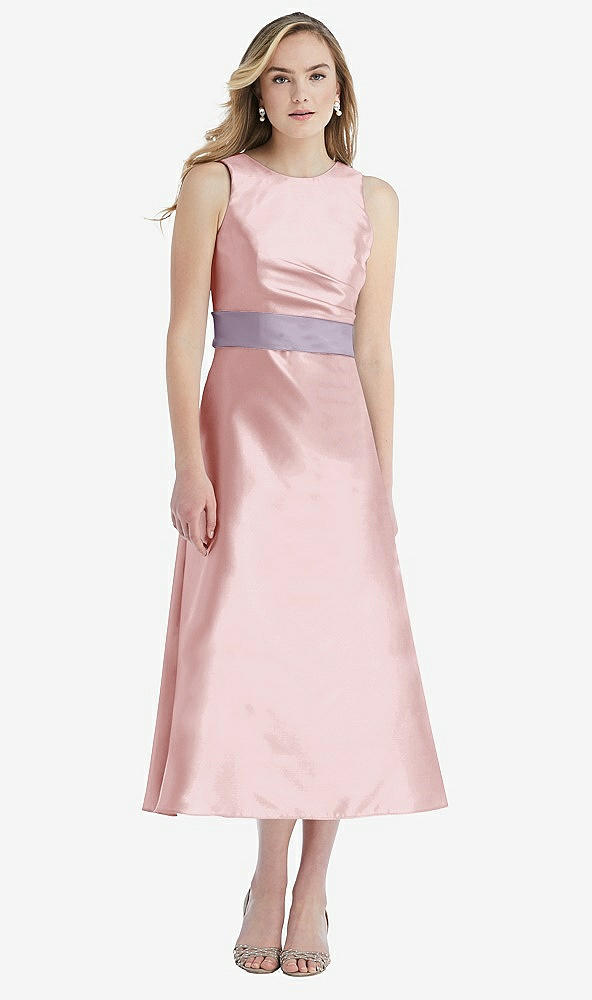 High-Neck Asymmetrical Shirred Satin Midi Dress with Pockets in Ballet Pink & Lilac Haze