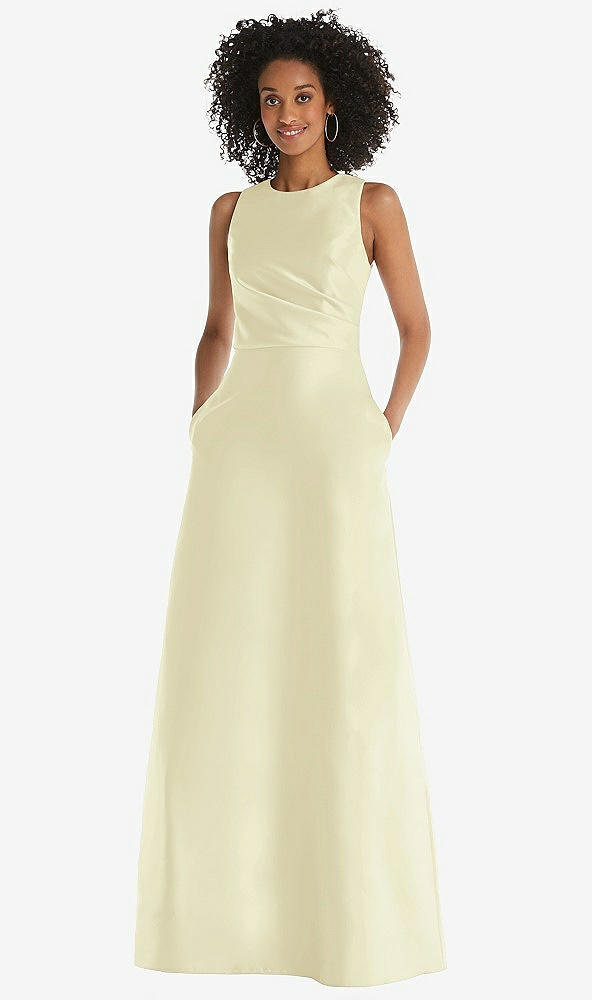 Jewel Neck Asymmetrical Shirred Bodice Maxi Dress with Pockets in Butter Yellow