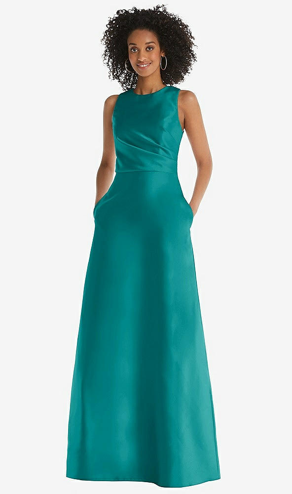 Jewel Neck Asymmetrical Shirred Bodice Maxi Dress with Pockets in Jade
