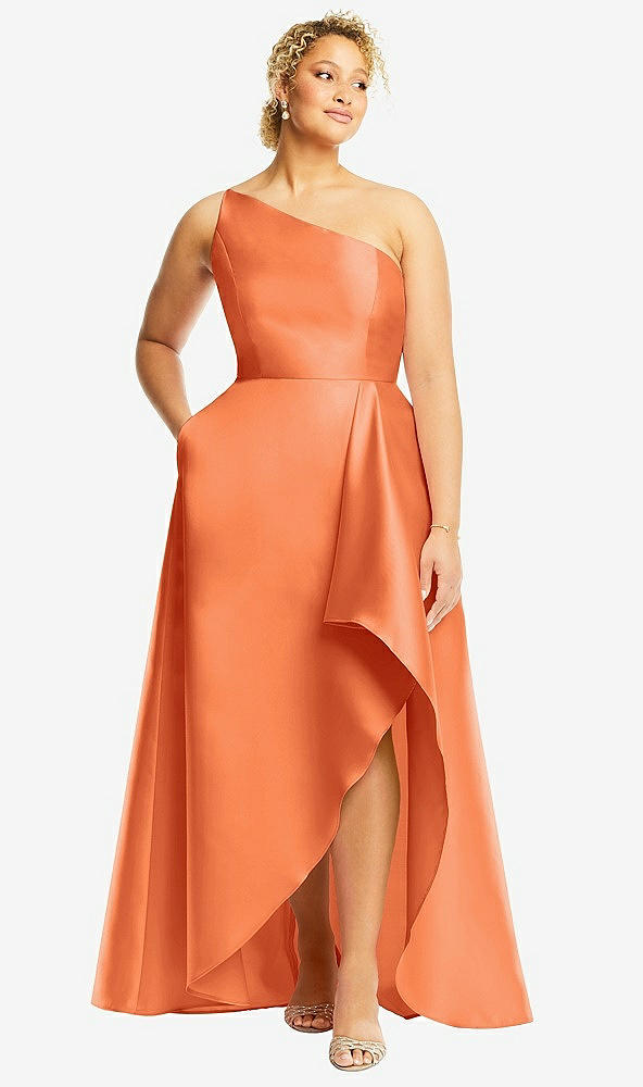 One-Shoulder Satin Gown with Draped Front Slit and Pockets in Portofino Orange