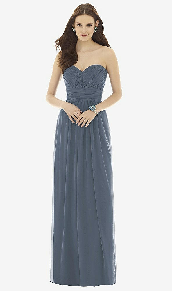 A fairy-tale sweetheart neckline charms with a softly draped bodice flowing in to an open back with a lovely streamer accent. Gracefully feminine, the softly shirred skirt highlights the chic delicate lines of this chiffon knit full-length sleeveless dress.
