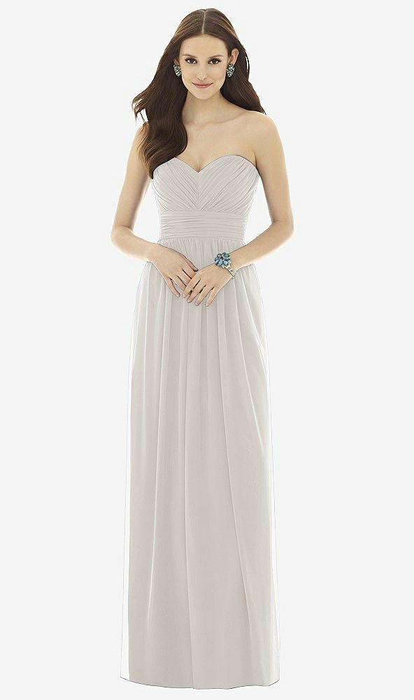 A fairy-tale sweetheart neckline charms with a softly draped bodice flowing in to an open back with a lovely streamer accent. Gracefully feminine, the softly shirred skirt highlights the chic delicate lines of this chiffon knit full-length sleeveless dress.