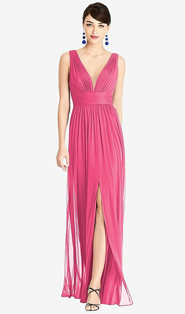 The deep plunging V-neck illusion sheer net bodice shows off a low back in this modernly elegant full-length sleeveless chiffon knit dress. A center front slit adds an alluring touch to the shirred skirt and is perfect for dancing the night away.