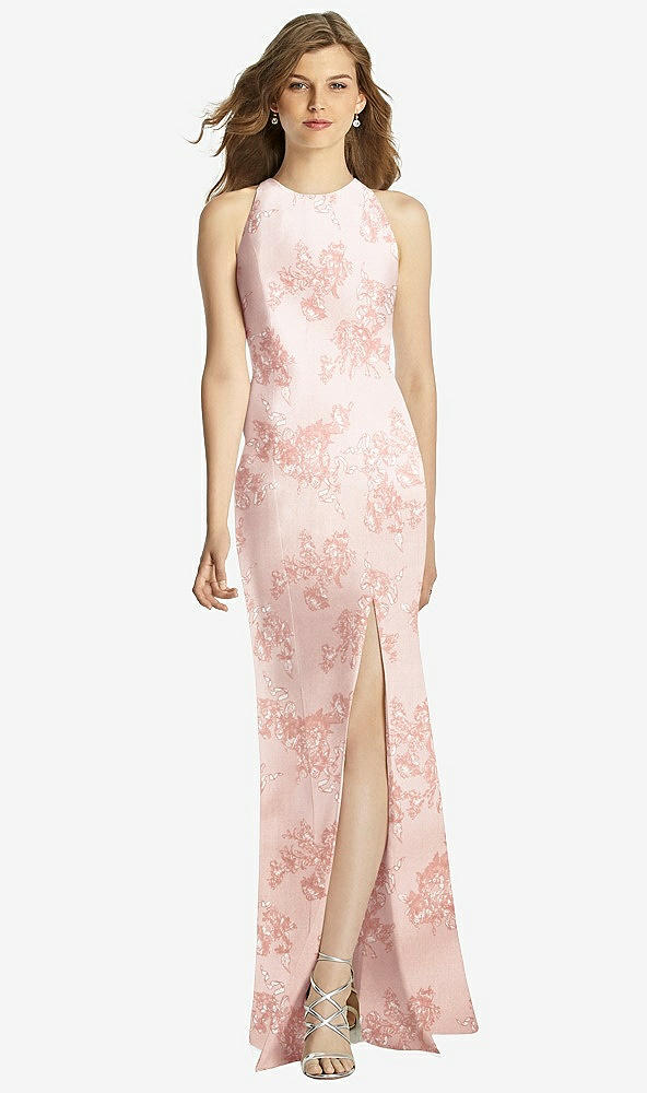 Full length sleeveless satin twill dress with jewel neckline and keyhole back. Trumpet skirt has slit at side front.