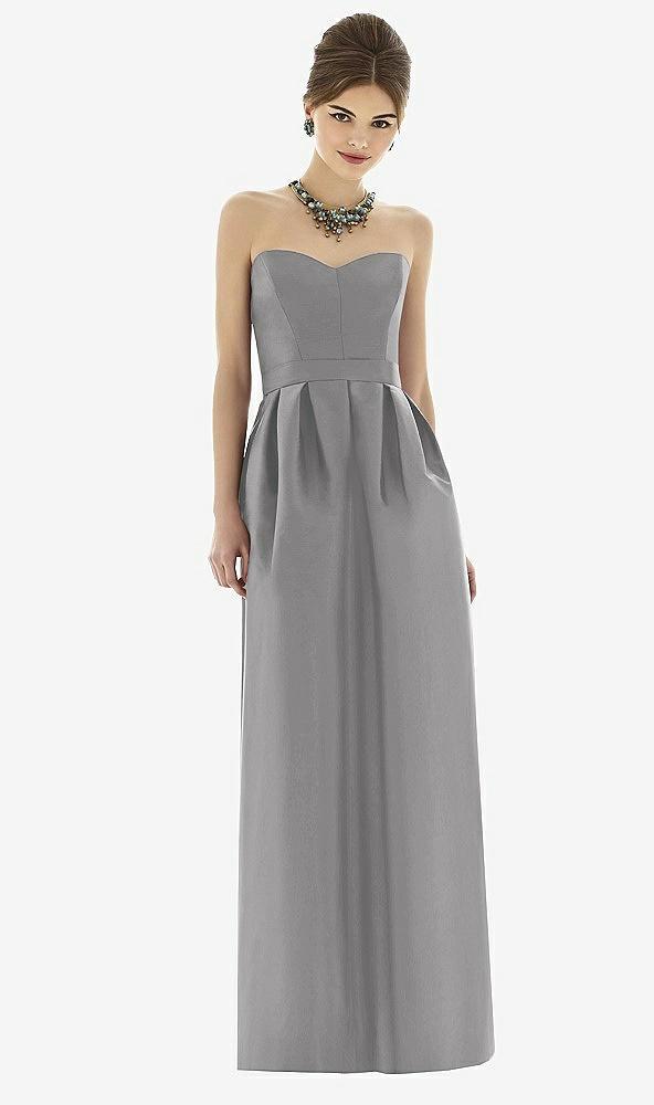 Full length strapless bridesmaid dress in dupioni fabric has pleated skirt. Pockets at side seams of skirt. Matching 1.75 belt. Also available cocktail length as style D618.