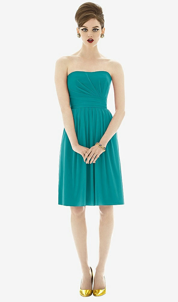 Cocktail length strapless chiffon knit dress with draped detail at bodice. Shirred skirt. Also available full length as style D651.