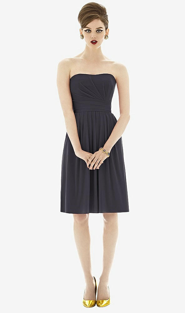 Cocktail length strapless chiffon knit dress with draped detail at bodice. Shirred skirt. Also available full length as style D651.