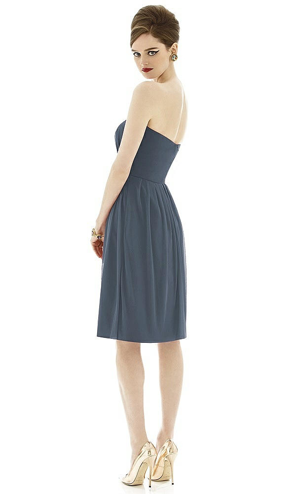 Cocktail length strapless chiffon knit dress with draped detail at bodice. Shirred skirt. Also available full length as style D651.