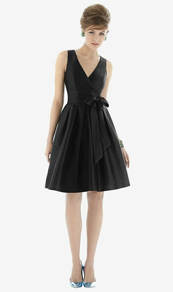Cocktail length sleeveless peau de soie dress with surplice neckline and matching sash at natural waist. Full pleated skirt with pockets at side seams.
