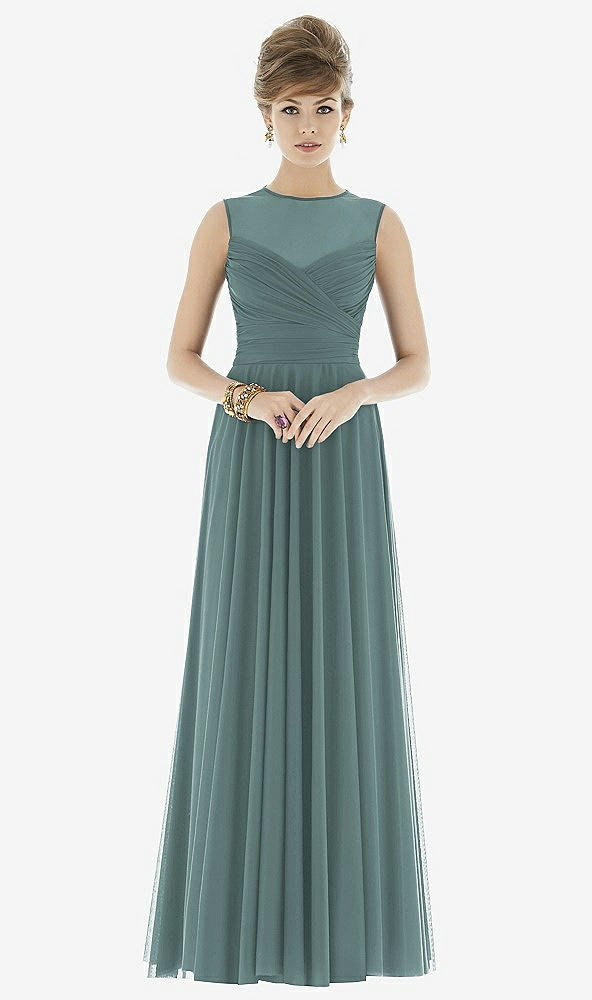 Full length sleeveless chiffon knit dress with draped bodice and sheer yoke detail. Modified circle skirt. Also available cocktail length as style D676.