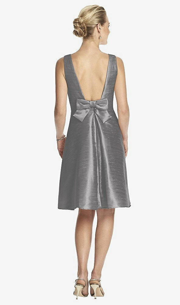 A classic bateau neckline meets an alluring open back with bow detail in this chic stunner. A tailored circle skirt with side seam pockets has an inverted center back pleat detail in this cocktail length sleeveless dupioni special occasion dress.