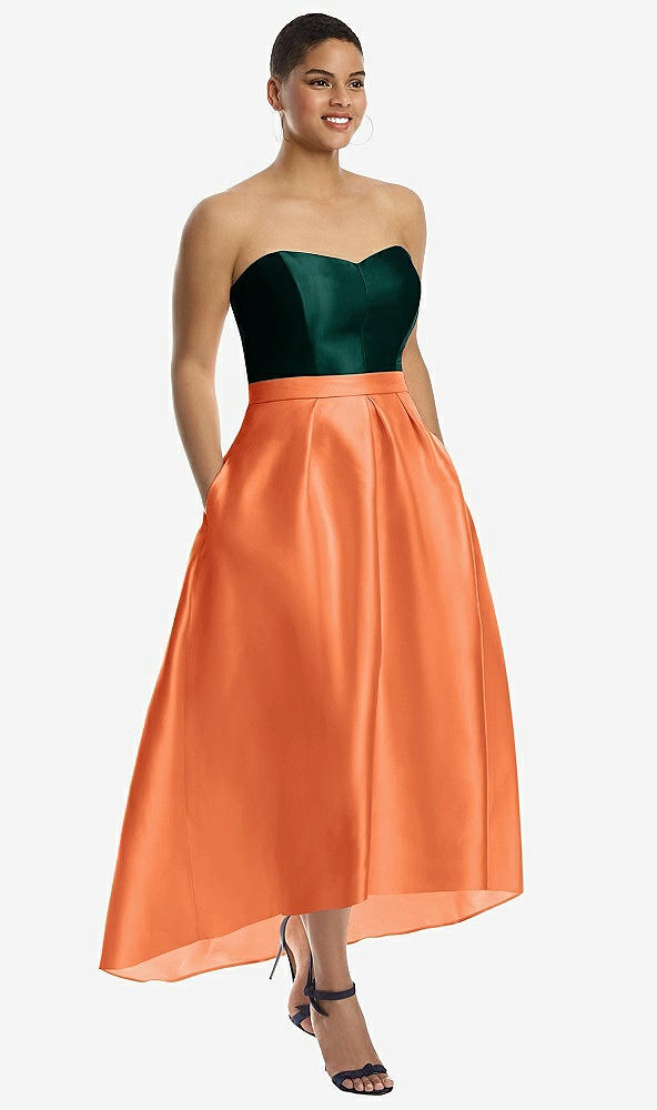 Strapless Satin High Low Dress with Pockets in Portofino Orange & Evergreen