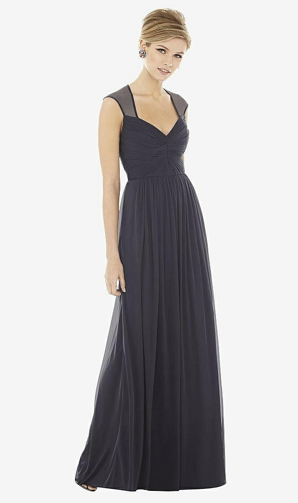 Delicately romantic with graceful cap sleeves, this chiffon knit dress is a study in elegance. The draped bodice is sweetly feminine while the sheer back adds an ethereal touch.