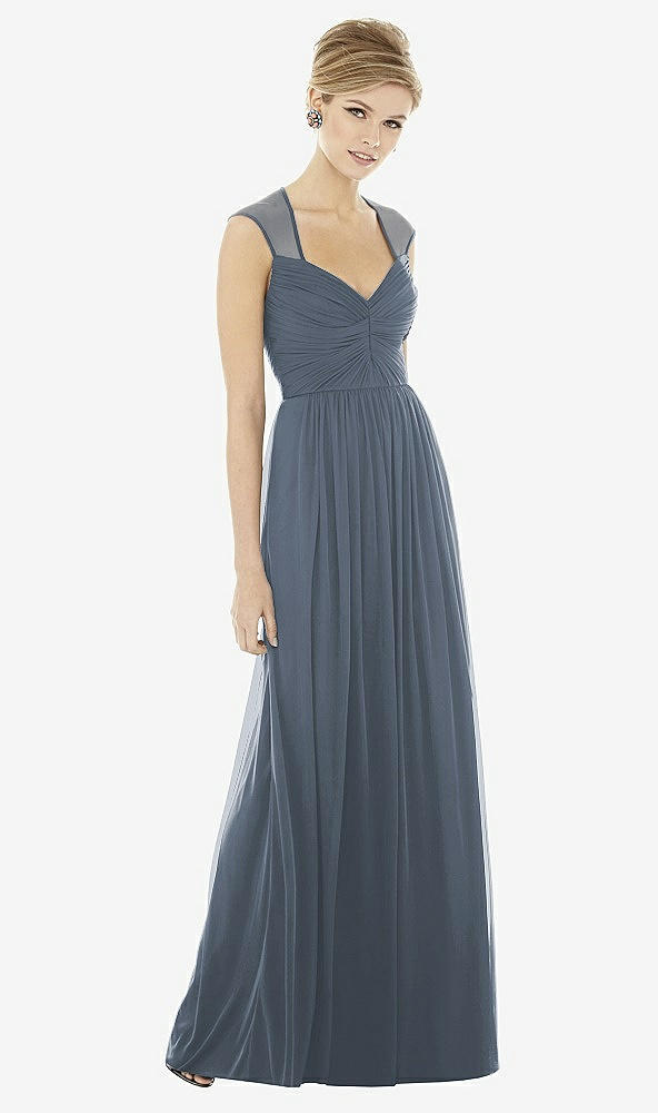 Delicately romantic with graceful cap sleeves, this chiffon knit dress is a study in elegance. The draped bodice is sweetly feminine while the sheer back adds an ethereal touch.