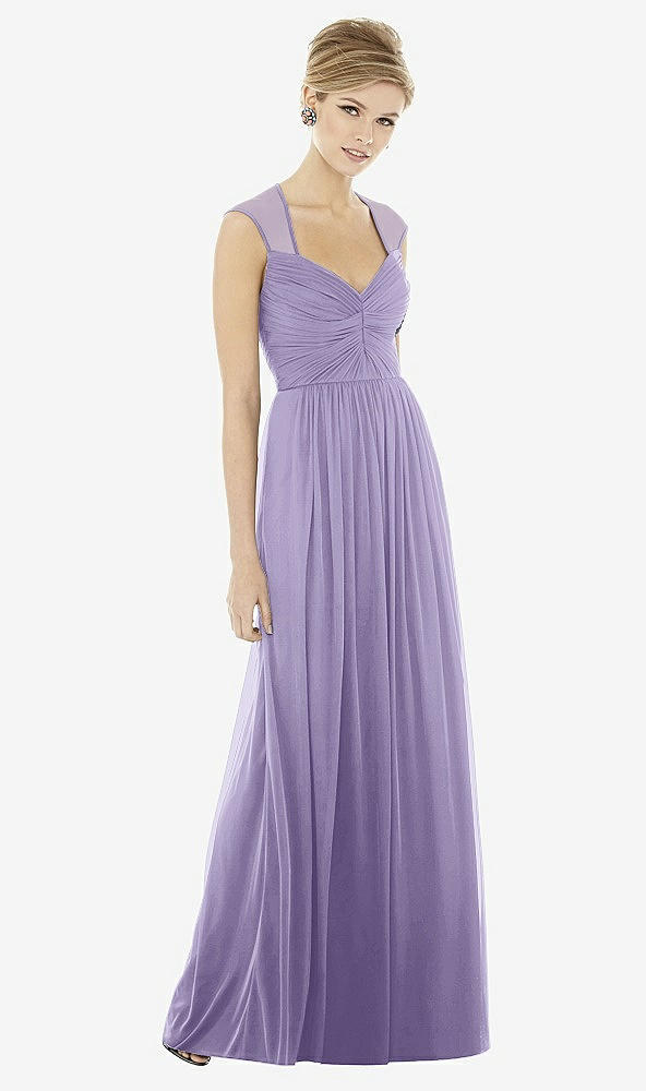 Delicately romantic with graceful cap sleeves, this chiffon knit dress is a study in elegance. The draped bodice is sweetly feminine while the sheer back adds an ethereal touch.