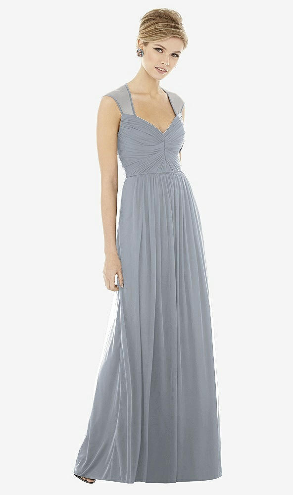 Delicately romantic with graceful cap sleeves, this chiffon knit dress is a study in elegance. The draped bodice is sweetly feminine while the sheer back adds an ethereal touch.