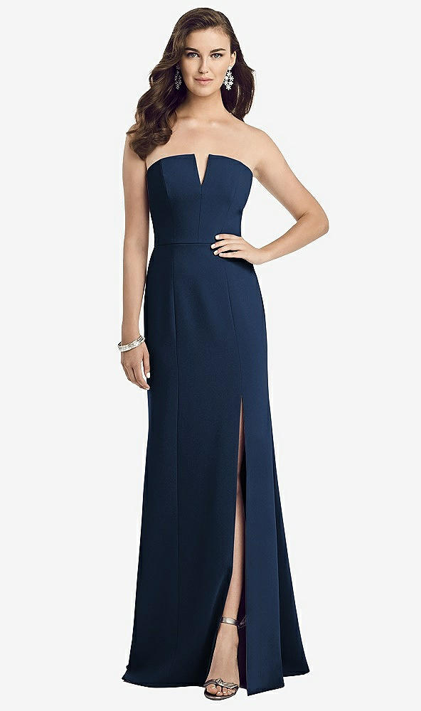 Strapless Notch Crepe Gown with Front Slit in Midnight Navy