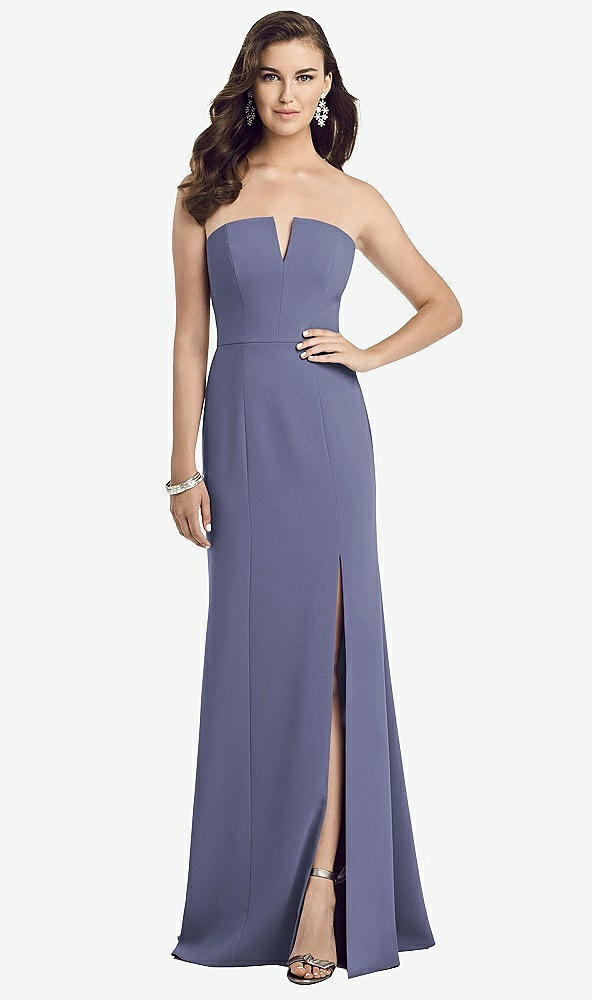 Strapless Notch Crepe Gown with Front Slit in French Blue