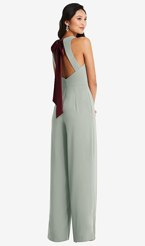 Cutout Open-Back Halter Jumpsuit with Scarf Tie in Willow Green & Cabernet