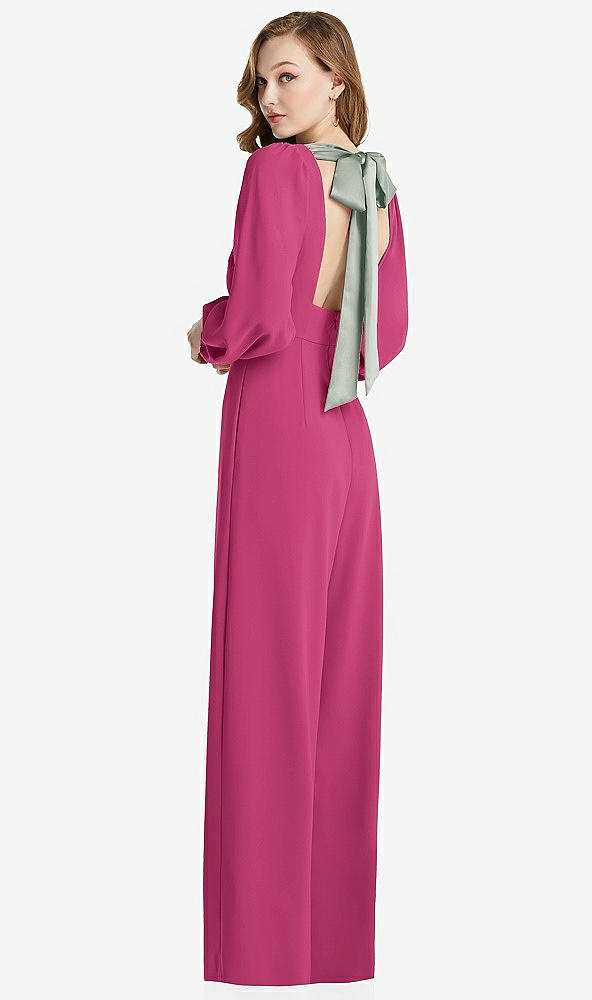 Bishop Sleeve Open-Back Jumpsuit with Scarf Tie in Tea Rose & Willow Green