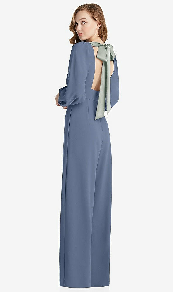 Bishop Sleeve Open-Back Jumpsuit with Scarf Tie in Larkspur Blue & Willow Green