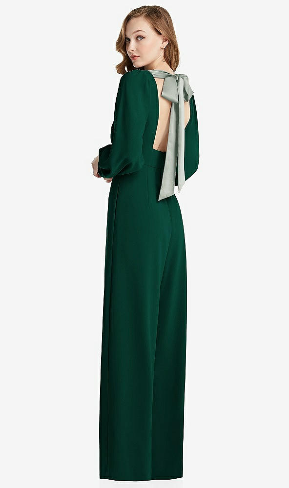 Bishop Sleeve Open-Back Jumpsuit with Scarf Tie in Hunter Green & Willow Green