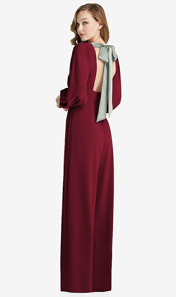 Bishop Sleeve Open-Back Jumpsuit with Scarf Tie in Burgundy & Willow Green