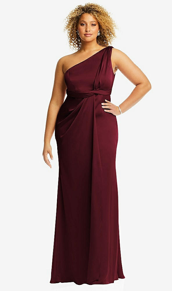 One-Shoulder Draped Twist Empire Waist Trumpet Gown in Cabernet
