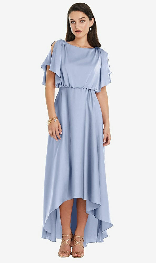 Blouson Bodice Deep V-Back High Low Dress with Flutter Sleeves in Sky Blue