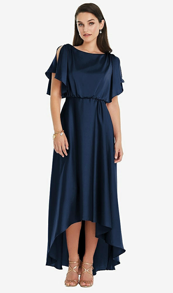 Blouson Bodice Deep V-Back High Low Dress with Flutter Sleeves in Midnight Navy