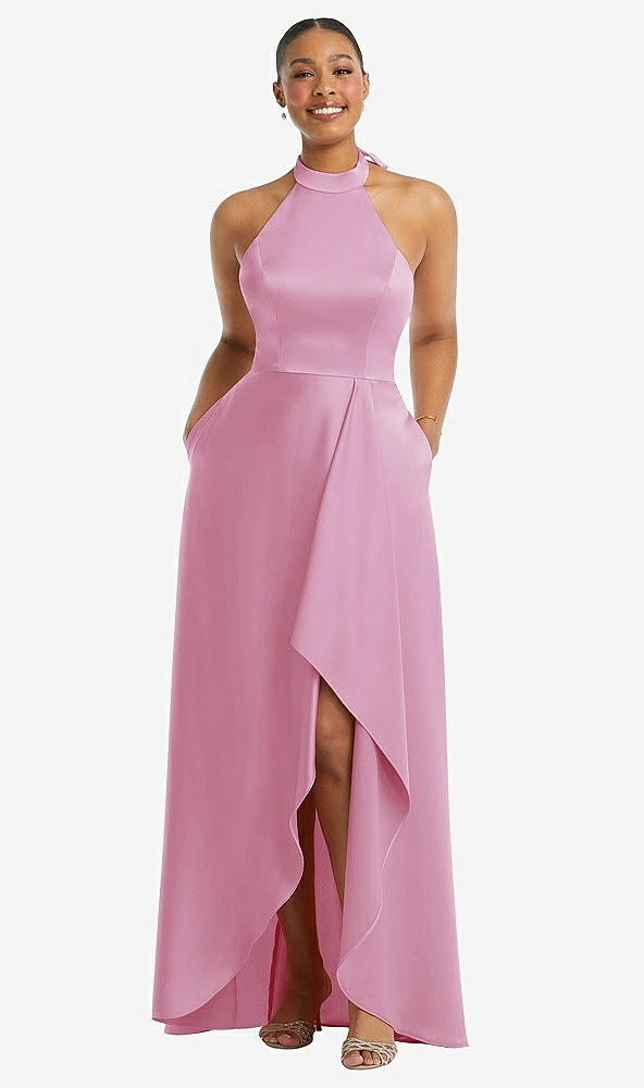 High-Neck Tie-Back Halter Cascading High Low Maxi Dress in Powder Pink