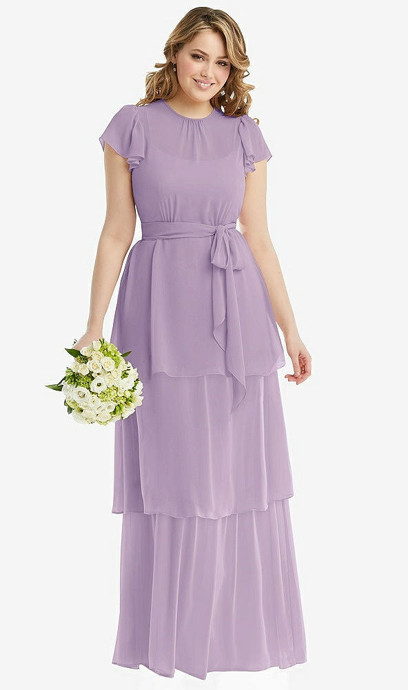 Flutter Sleeve Jewel Neck Chiffon Maxi Dress with Tiered Ruffle Skirt in Pale Purple