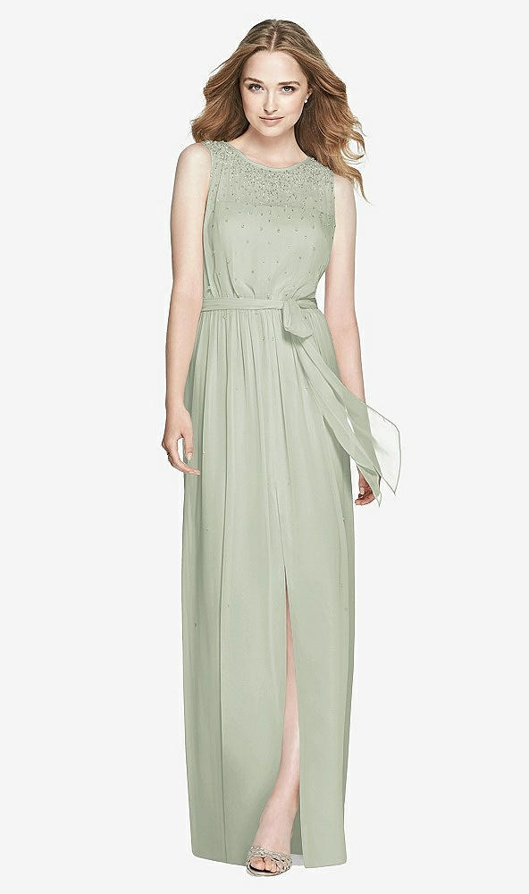 Charmingly sweet, the sheer jewel neckline on this full-length lux chiffon sleeveless bridesmaid dress features graded sequin and bead details that flow down to a shirred skirt. Complete a romantic silhouette with a sashed empire waist and strapless under bodice. Dazzle with a center front slit on the flowy skirt.