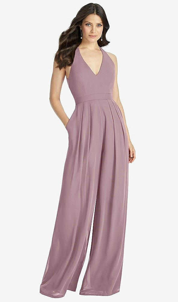 V-Neck Backless Pleated Front Jumpsuit in Dusty Rose