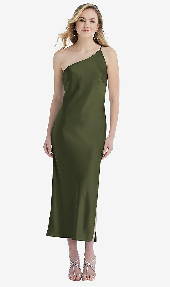 One-Shoulder Asymmetrical Midi Slip Dress in Olive Green