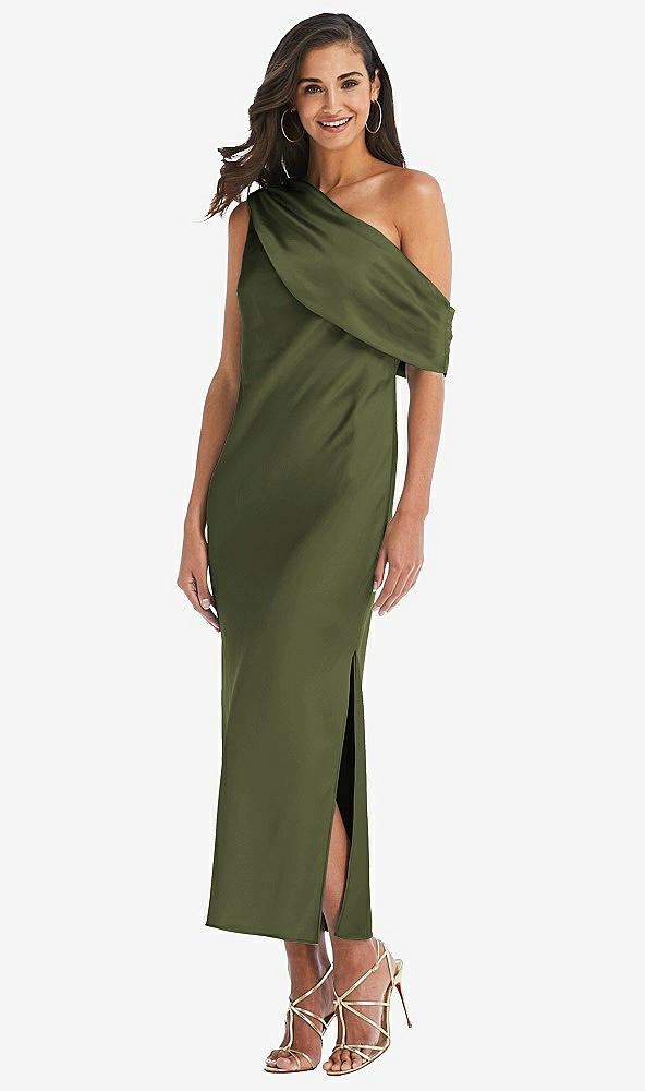 Draped One-Shoulder Convertible Midi Slip Dress in Olive Green