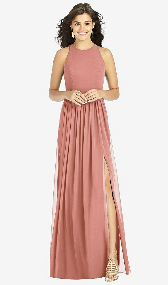 Shirred Skirt Jewel Neck Halter Dress with Front Slit in Desert Rose