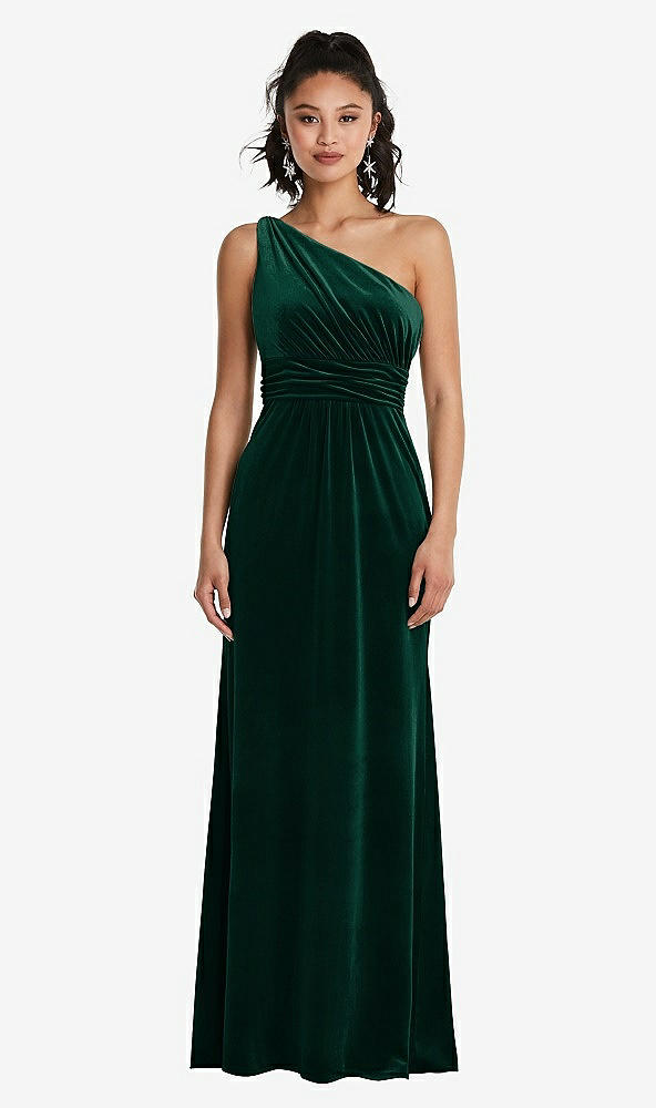 One-Shoulder Draped Velvet Maxi Dress in Evergreen