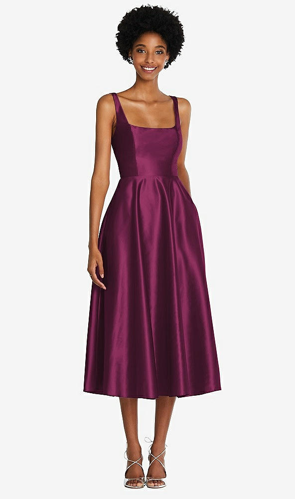 Square Neck Full Skirt Satin Midi Dress with Pockets in Ruby