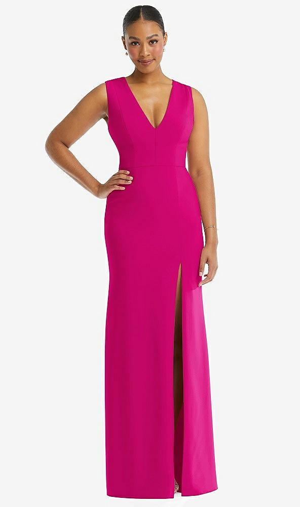 Deep V-Neck Closed Back Crepe Trumpet Gown with Front Slit in Think Pink