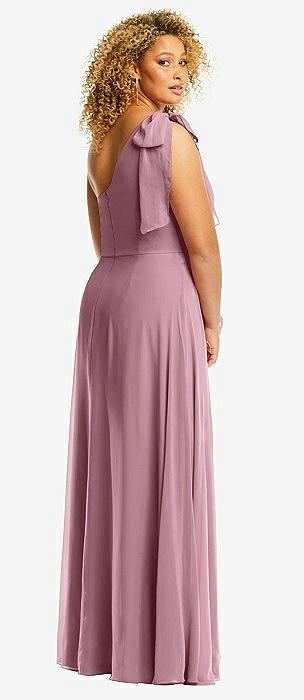 One-Shoulder Chiffon Maxi Dress with Shirred Front Slit in dusty pink