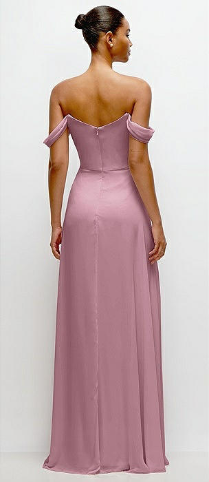 Bow-Shoulder V-Back Chiffon Gown with Front Slit in dusty pink