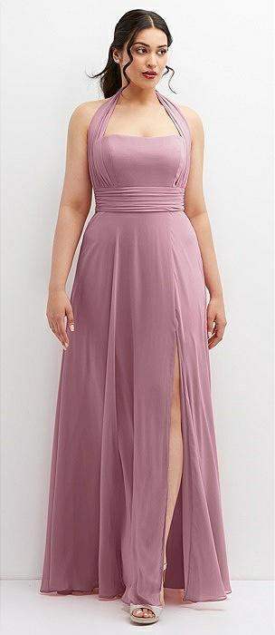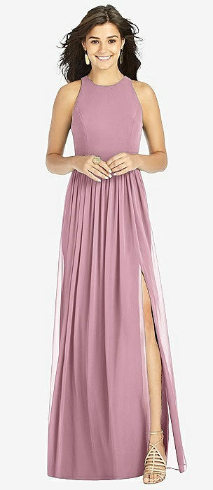 Shirred Skirt Jewel Neck Halter Dress with Front Slit in dusty pink