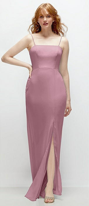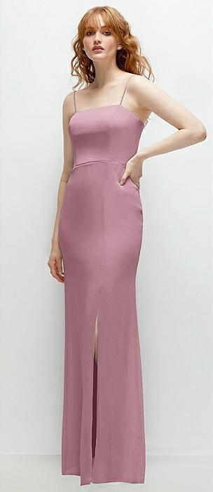 Spaghetti Strap Draped Skirt Gown with Front Slit in dusty pink