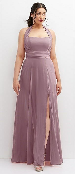 Shirred Skirt Jewel Neck Halter Dress with Front Slit in dusty rose