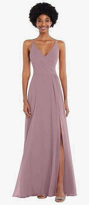 Spaghetti Strap Draped Skirt Gown with Front Slit in dusty rose