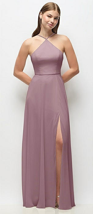 High-Neck Halter Chiffon Maxi Dress with Adjustable Spaghetti Straps in dusty rose