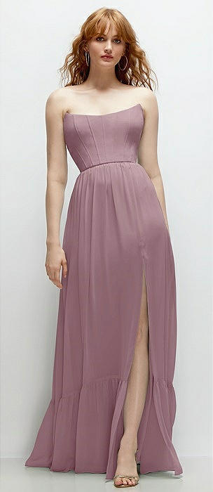 Strapless Cat-Eye Corset Maxi Dress with Ruffle Hem A-Line Skirt in dusty rose